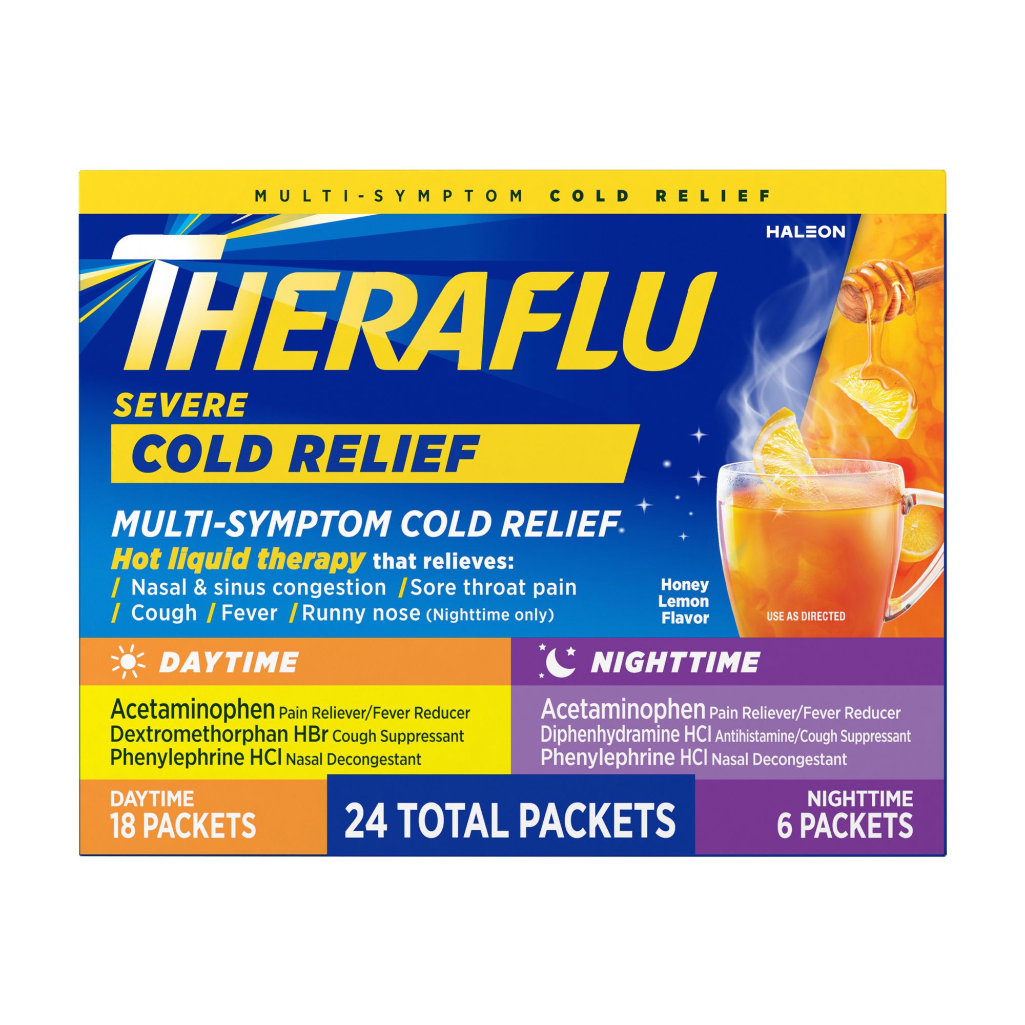 Theraflu nighttime multi symptom severe cold hot liquid powder contains acetaminophen 500 mg diphenhydramine hcl 25 mg and phenylephrine hci 10 mg to help get you back on your feet.